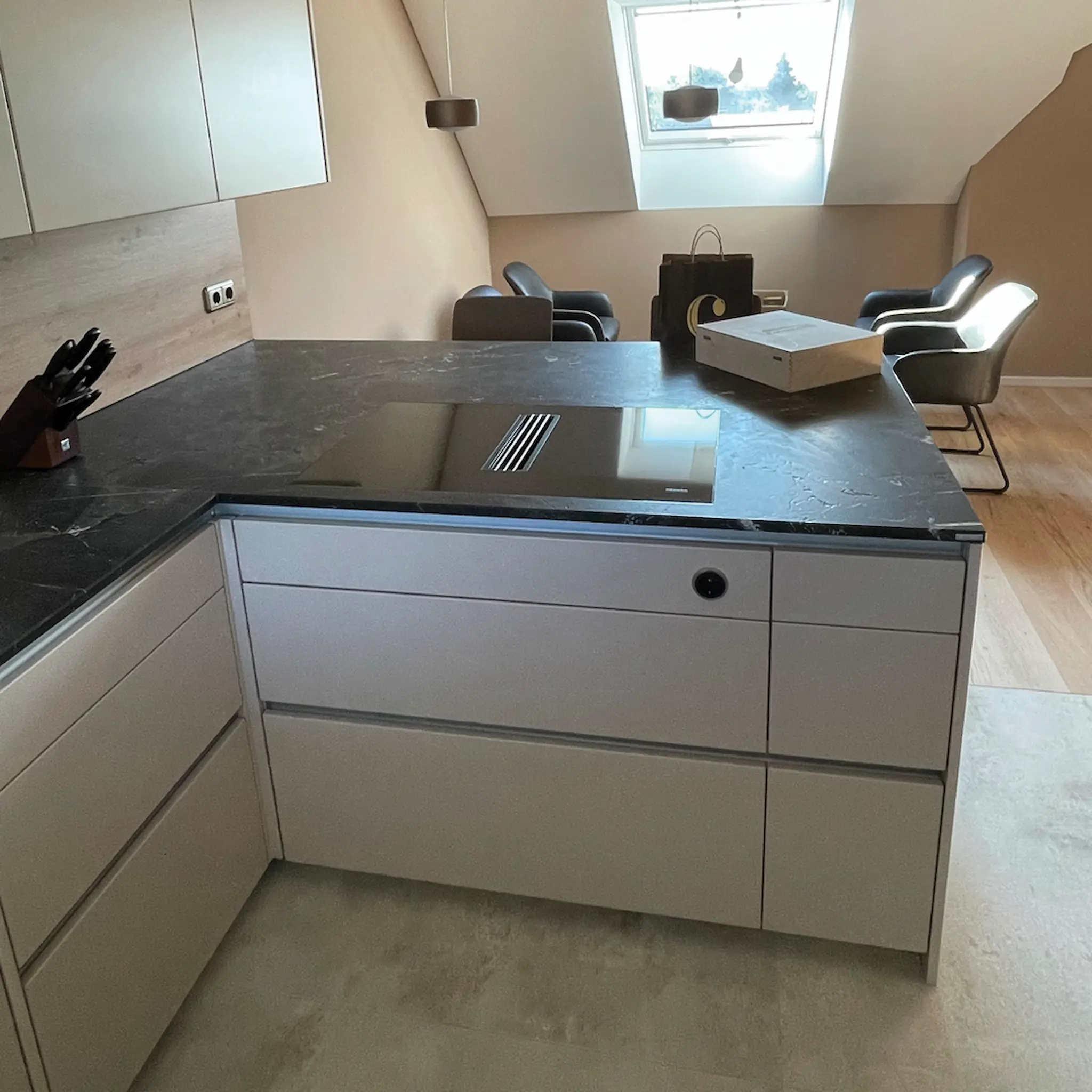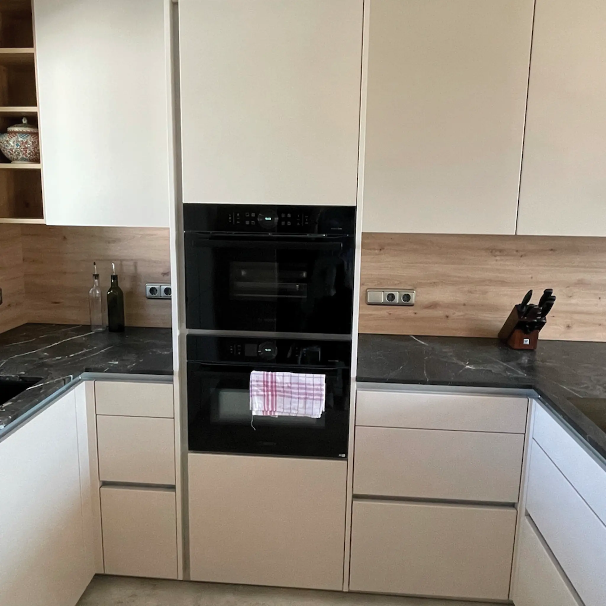 Die Küche wurde mit hellen, matten Fronten umgesetzt, kombiniert mit einer dunklen Stein-Arbeitsplatte, die einen eleganten Kontrast zur hellen Gestaltung bildet. Die Rückwand in Holzoptik bringt zusätzliche Wärme in den Raum und verbindet Küche und Wohnbereich optisch miteinander.