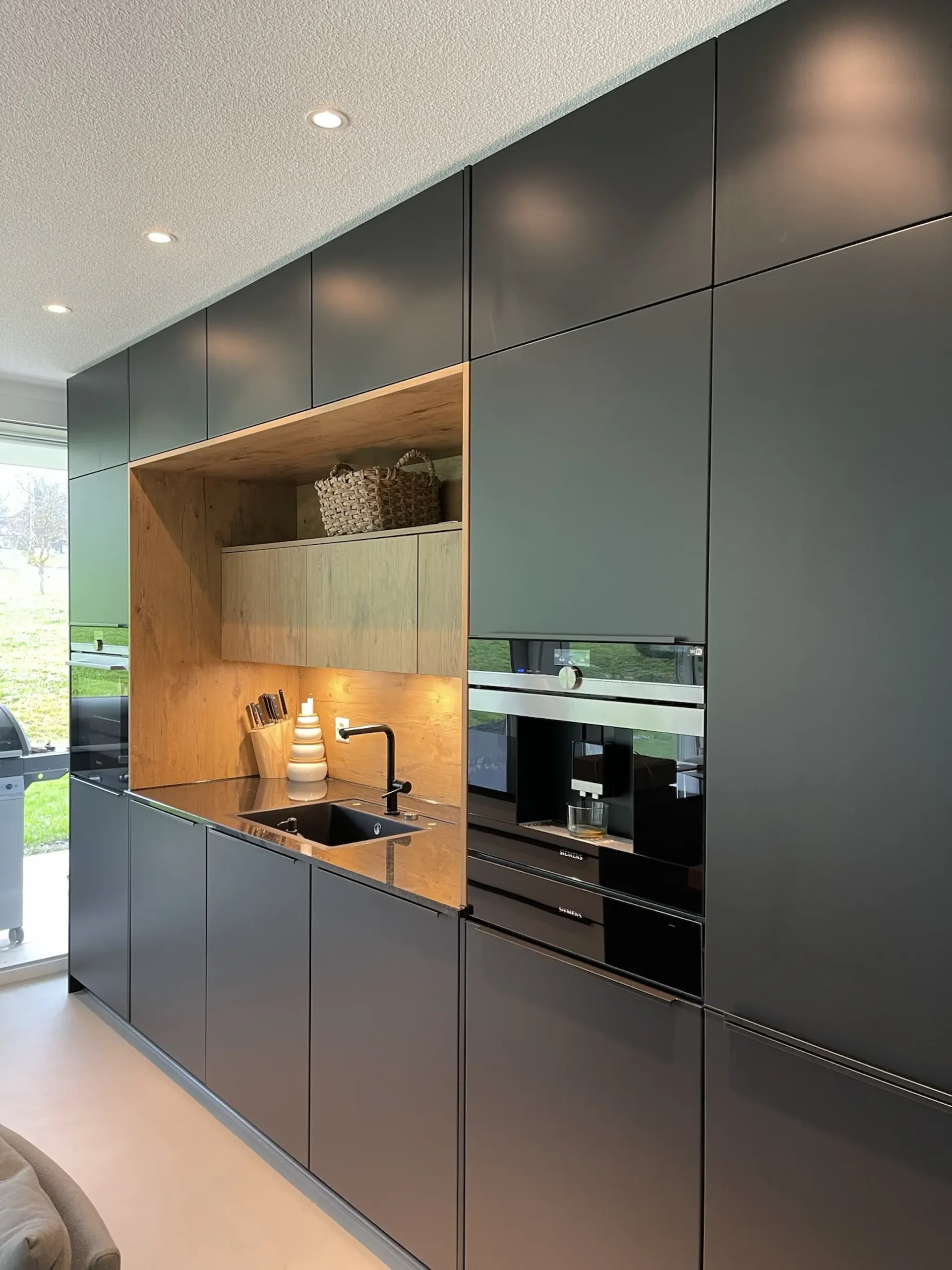 Umgesetzt wurde die Küche mit Fronten in Anthrazit und Polarweiß, kombiniert mit einem Holzdekor in Eiche. Die warm beleuchtete Nische im Hochschrankbereich bringt zusätzliche Tiefe in die Gestaltung und setzt einen wohnlichen Akzent.